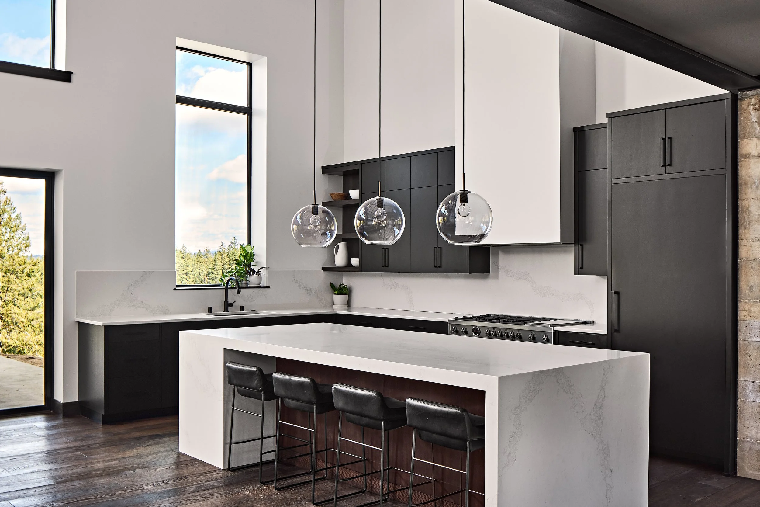 Set high on Spokane’s Shady Slope, this Scandinavian-inspired home was designed for a local business owner and artist. The site offers sweeping views across the treed skyline toward Mt. Spokane, but its defining features were the massive rock outcroppings discovered early in design. Rather than removing these geologic forms, the architecture bends around them — creating framed moments where bedrock and horizon meet, inviting reflection on both the raw terrain and the expansive landscape beyond.
