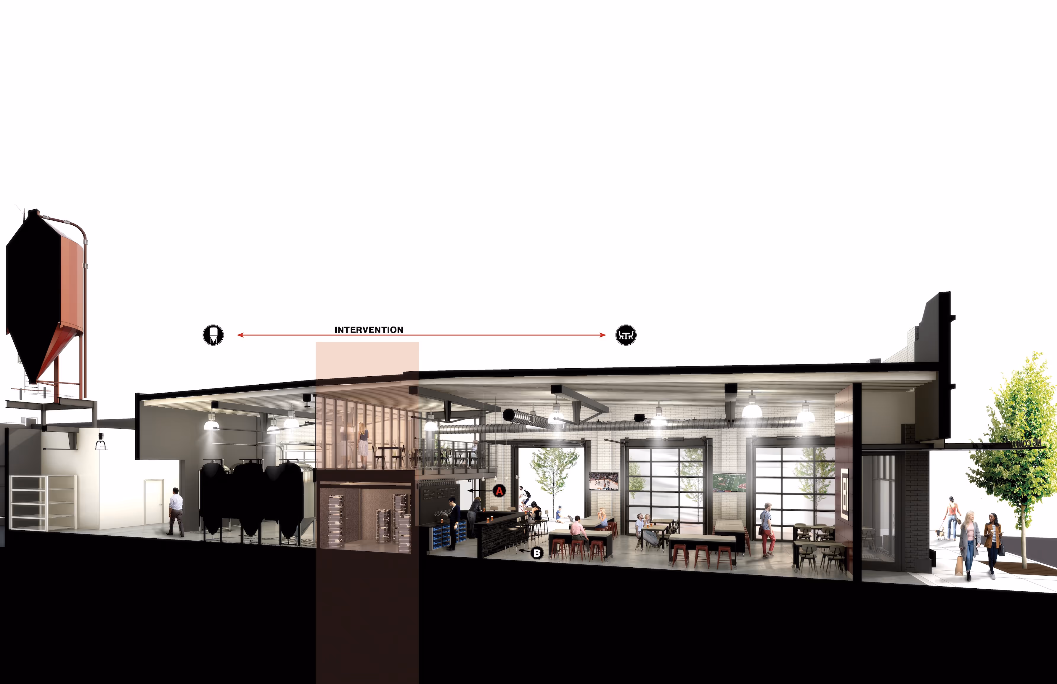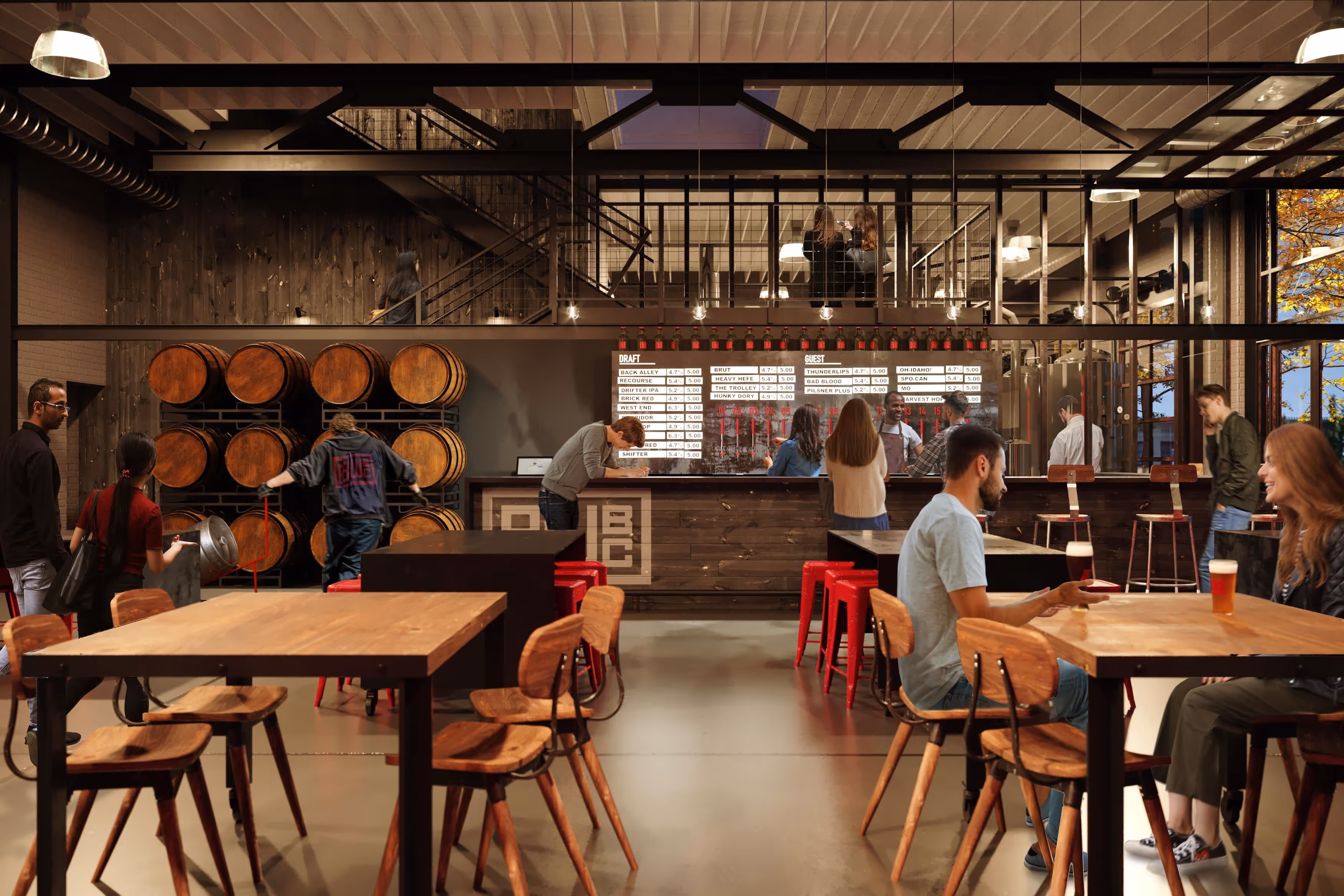 The design sought to honor the building’s industrial past while creating a transparent connection to the brewing process. A storefront wall of glass places the brewhouse in full view, with the bar and taps strategically located as a vantage point overlooking the equipment. Guests experience both the airy volume of the taproom and the energy of production, bringing craft and community into one shared space.