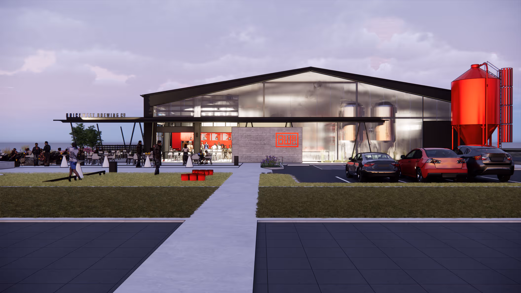 What might have been a simple metal warehouse was reimagined as a visible brand statement and beacon of production. An angled entry canopy recalls the form of hop trellises, rooting the building in the culture of beer-making. A translucent wall reveals the brewing vessels within, while the taproom becomes a bold, brand-red insertion that anchors the experience. Together, these moves transform an industrial facility into both a place of craft and a landmark for a continually expanding company.