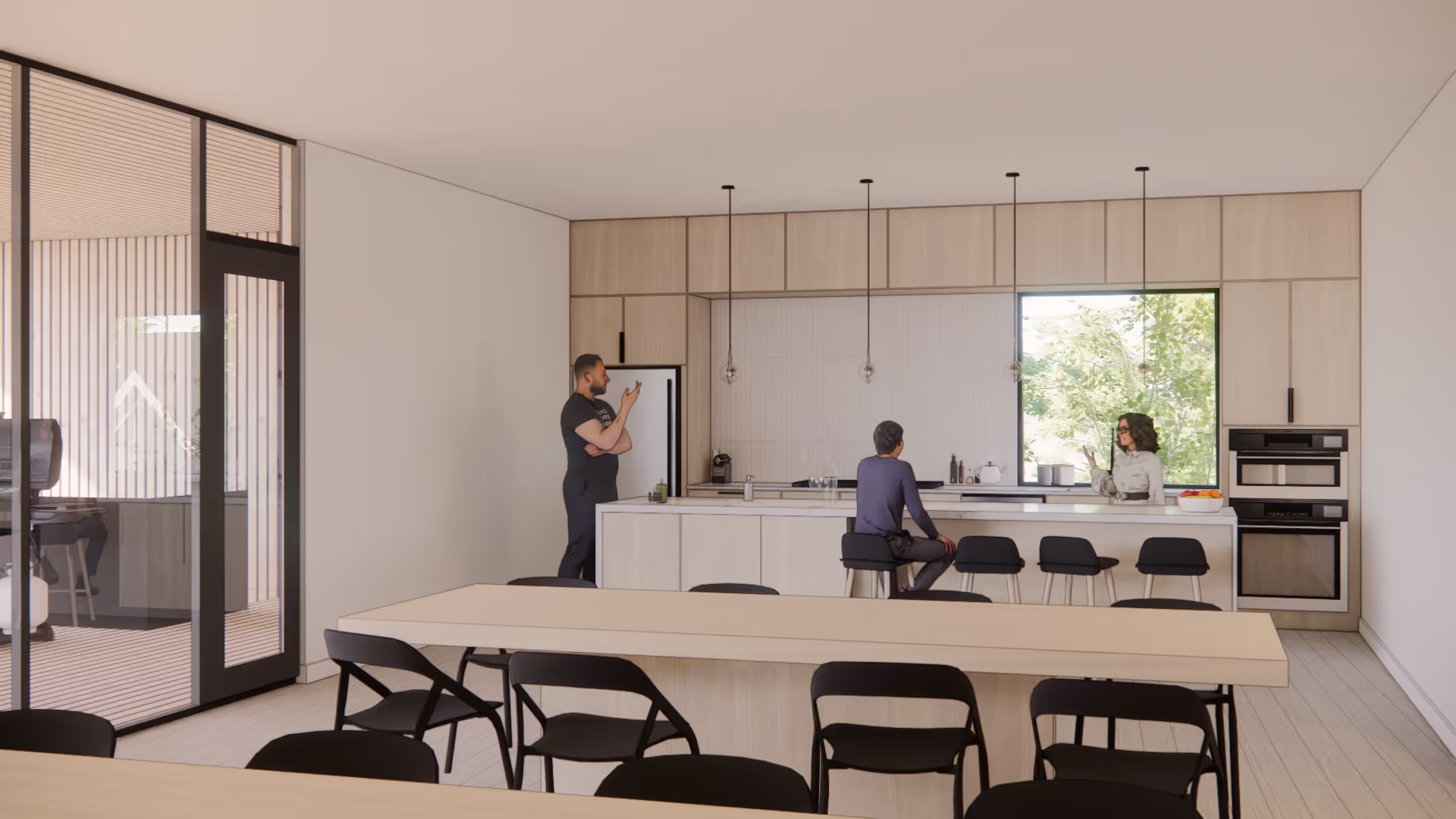 The two-story entry and lobby set the tone: bright, airy, and refined, with Scandinavian undertones that emphasize clarity and simplicity. Advisor offices and conference rooms are complemented by a multi-use gathering space that can transform for lectures, training sessions, and mission-driven community events. This adaptability allows the building to support both the professional and educational goals of the practice, while also accommodating staff and family use.