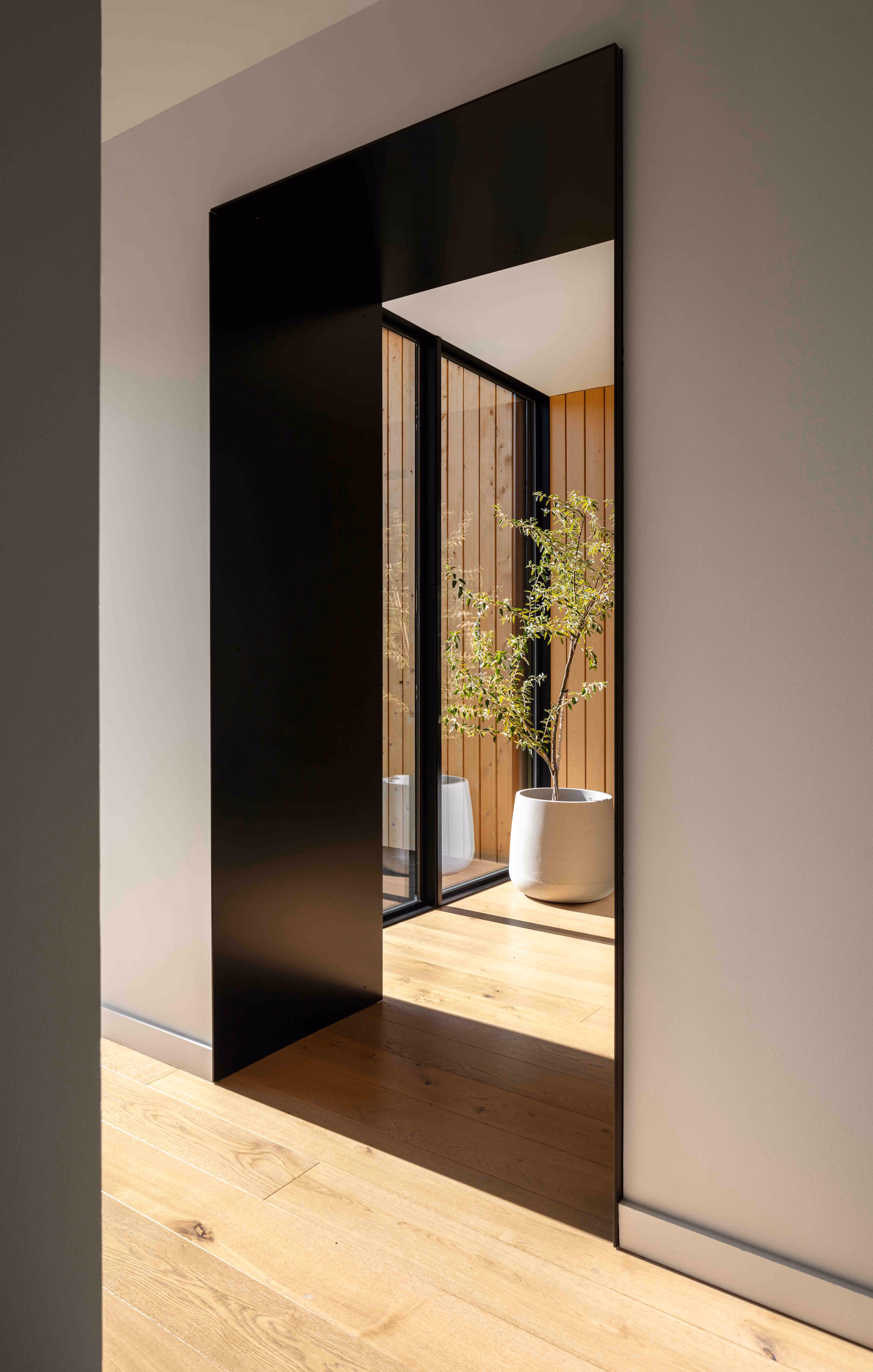The residence is arranged as three distinct pods, separating public and private uses while preserving a sense of intimacy. The children’s wing contains seven compact “micro-rooms,” each providing personal space without inflating the overall scale of the house. At the center, a courtyard anchors the home — a gathering place with a pool and a 32-foot-wide sliding door that dissolves the boundary between interior living and outdoor activity.