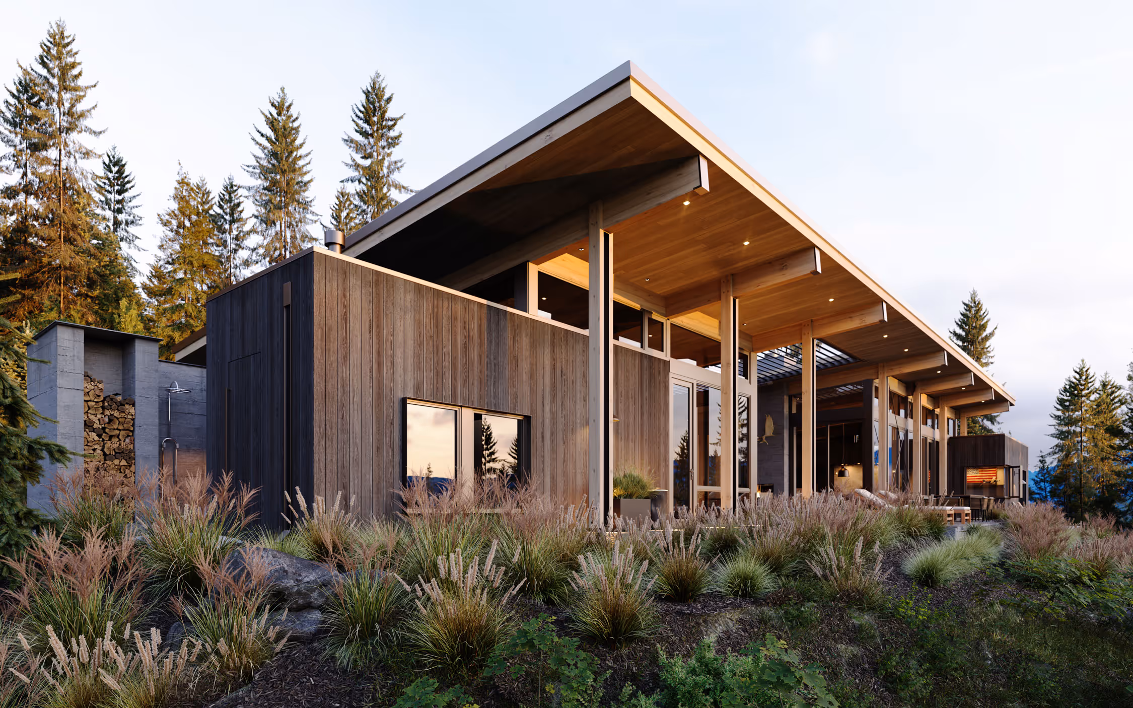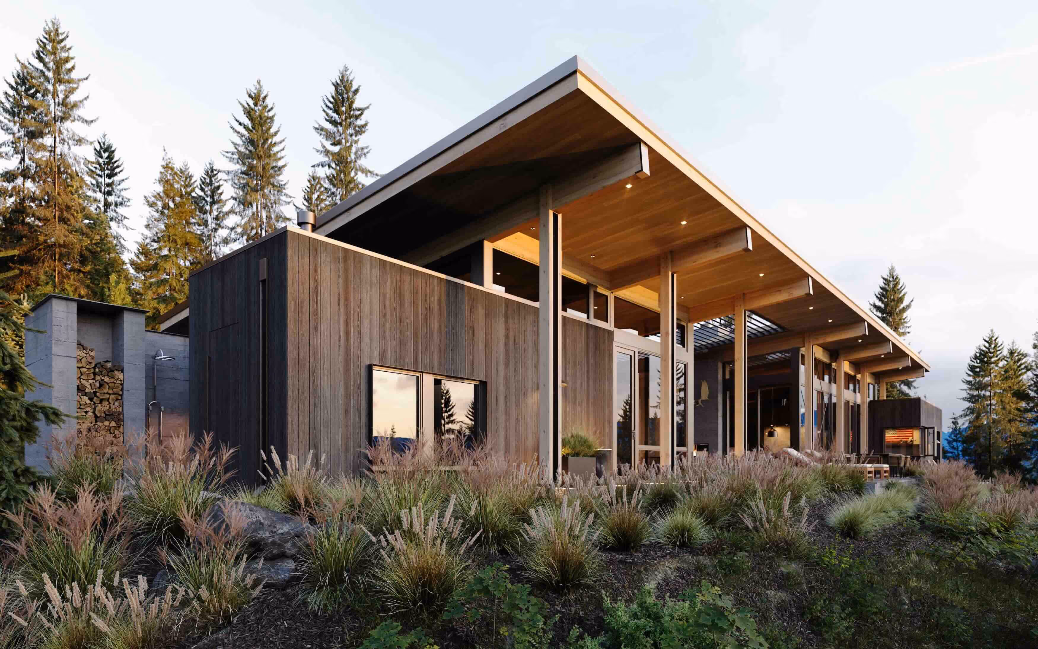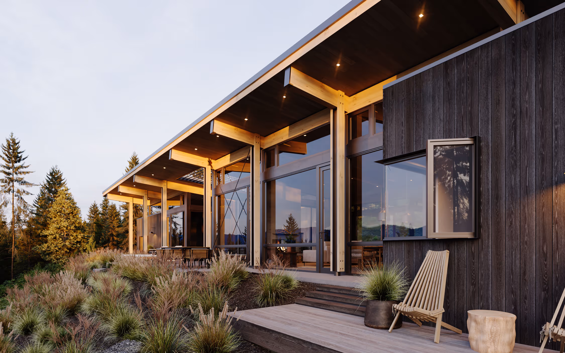 An expansive glass pavilion is grounded by two solid volumes that step gently with the terrain. At the entry, board - formed concrete walls frame a rock garden, blurring the threshold between landscape and architecture. Textures and details are layered with care, allowing the house to feel deeply rooted in its natural surroundings.