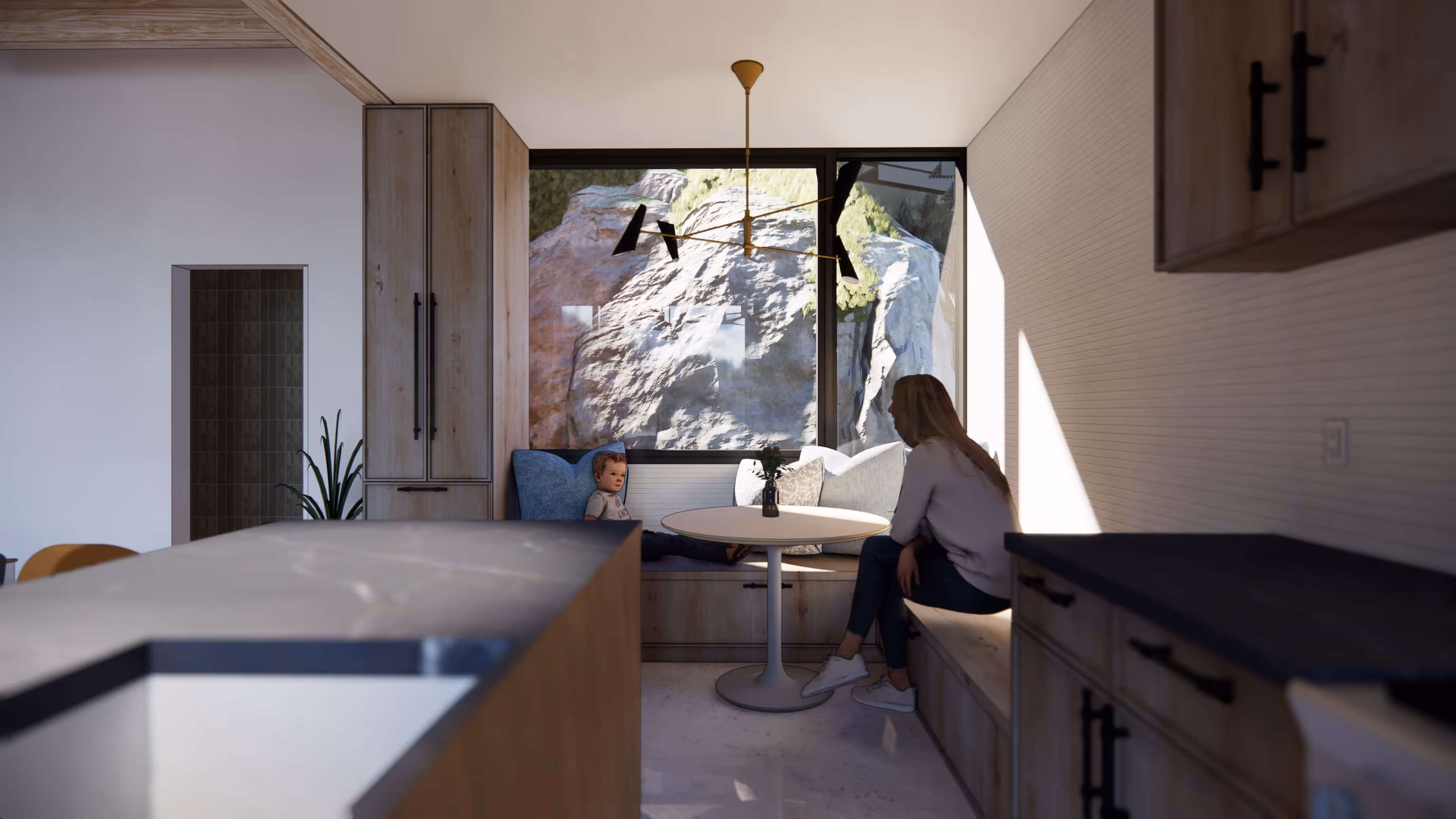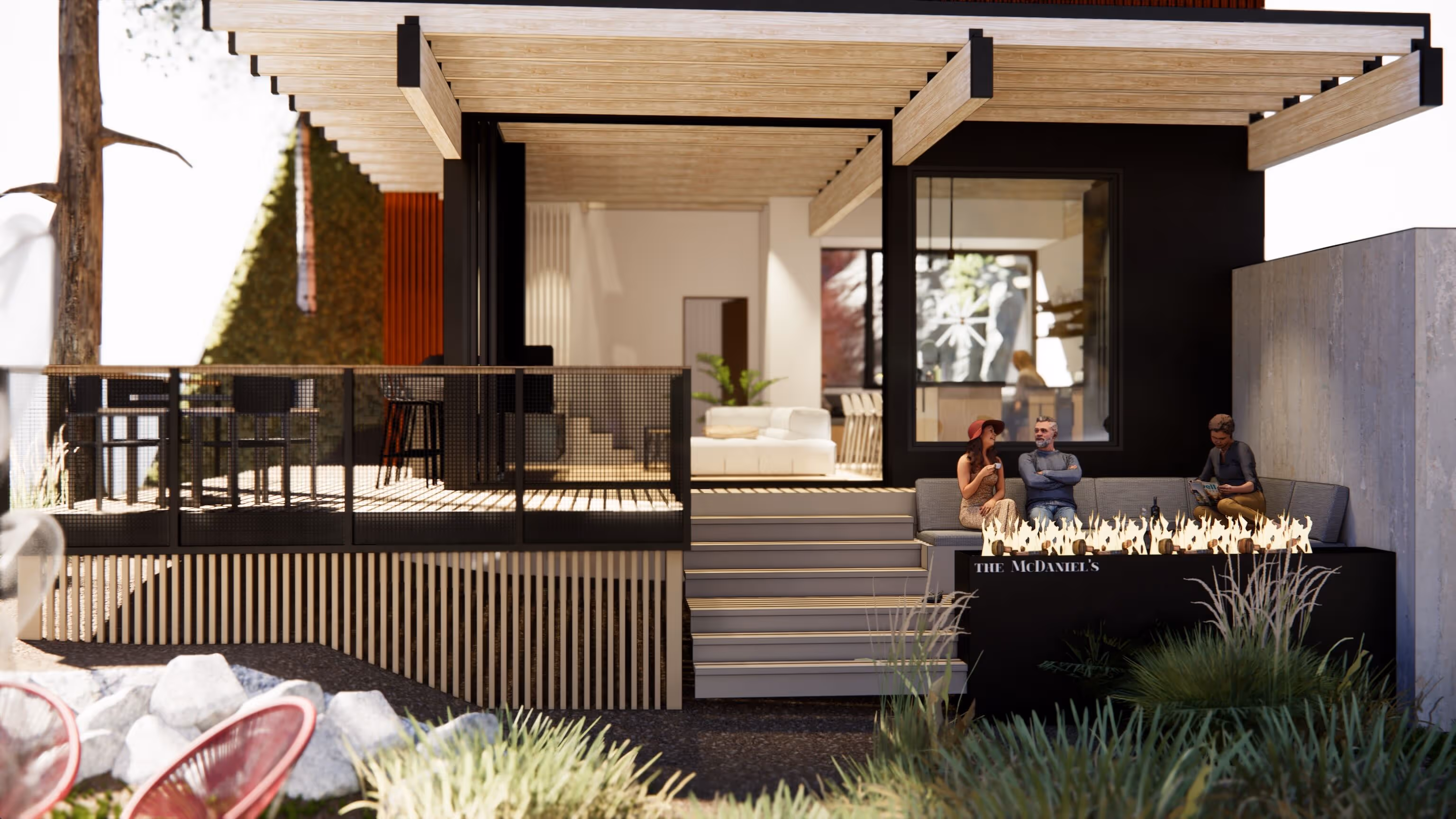 Arrival occurs by way of an artful steel bridge from the road above, leading directly into the uppermost level. From there, a progression down through the floors reveals intimate connections to the rocky cliff face, draped in moss and ferns, before reaching the lake’s edge. The ground level becomes the heart of the home — a gathering space that opens to a generous deck with creative seating and a built-in fire feature, offering the perfect setting for sunsets over the water.