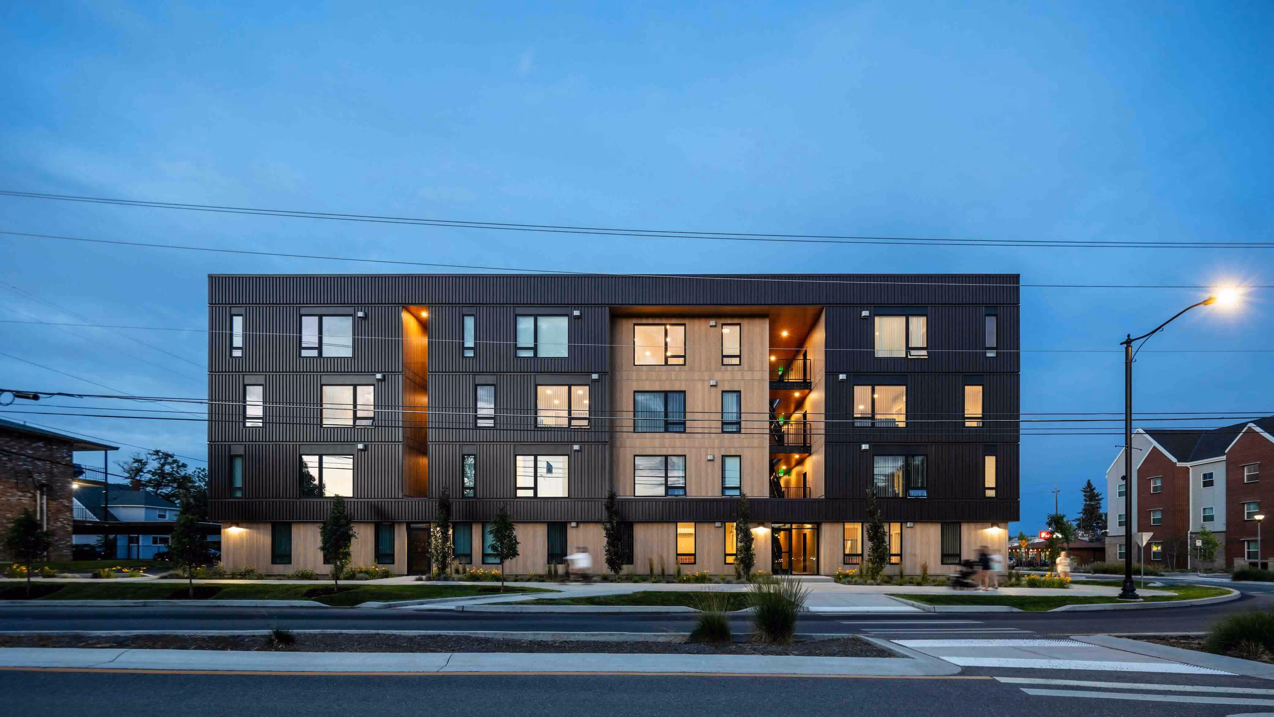 Durable materials pair with expressive details: metal siding and integrated exterior lighting that animates the façade. The lighting shifts colors to mark community moments — from Gonzaga game nights to holidays — transforming the building into a dynamic identity piece for residents and neighbors alike.
