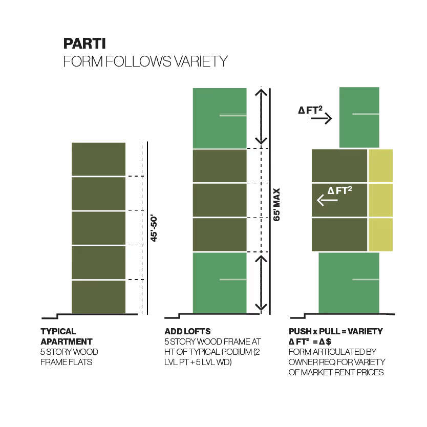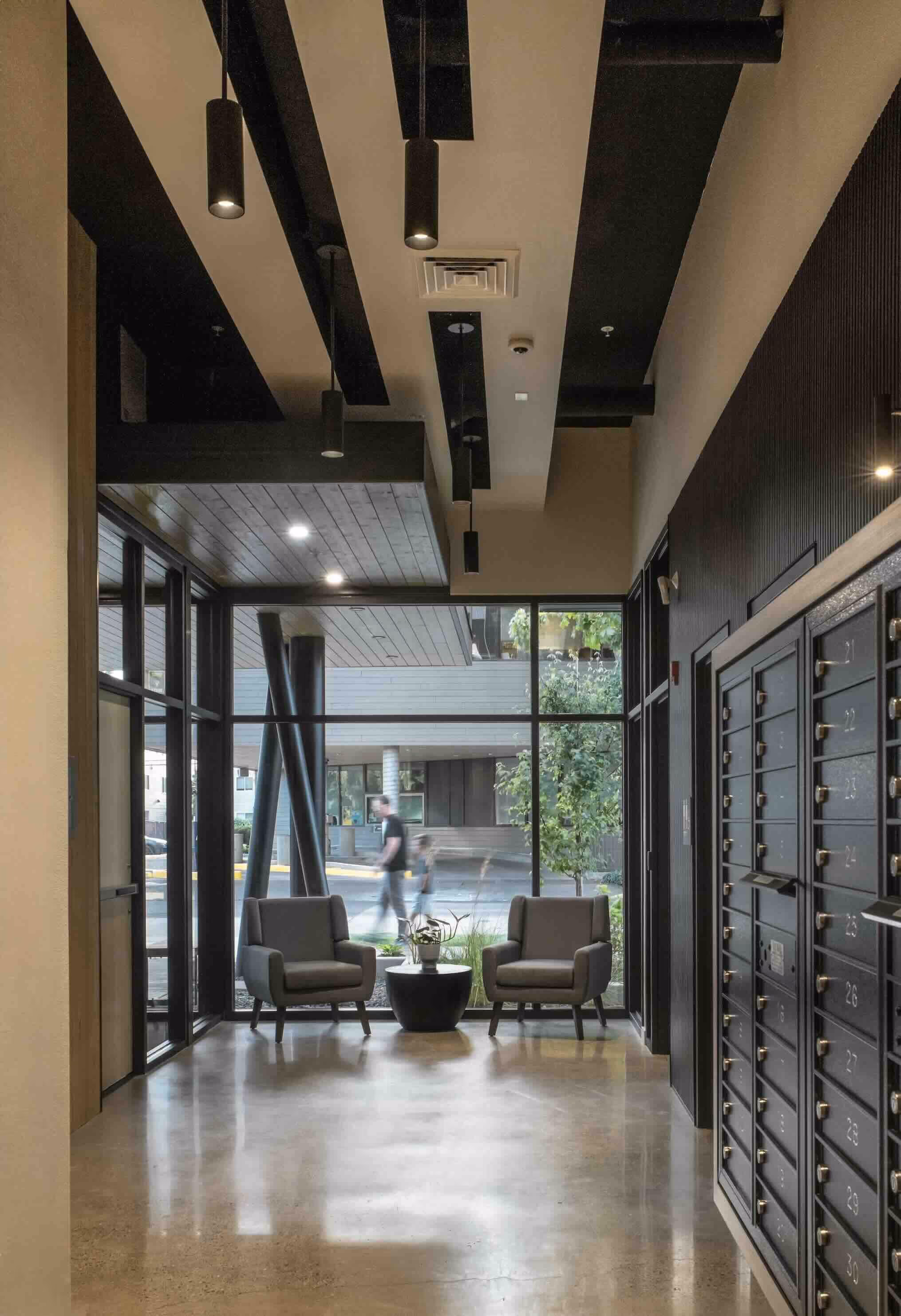 Inside, the units are carefully designed for student living. Each includes a kitchenette, with shared laundry and full kitchens provided on alternating floors. Higher ceiling heights on the first and fifth levels allow lofts to be tucked above bathrooms, creating privacy and spatial variety within the studio typology. A polished concrete lobby and leasing office anchor the ground floor, while secured bike storage and regionally themed graphics in the elevator lobbies reinforce the building’s identity. Tilted concrete entry columns echo the evergreens of the Pacific Northwest, rooting the project in its setting.