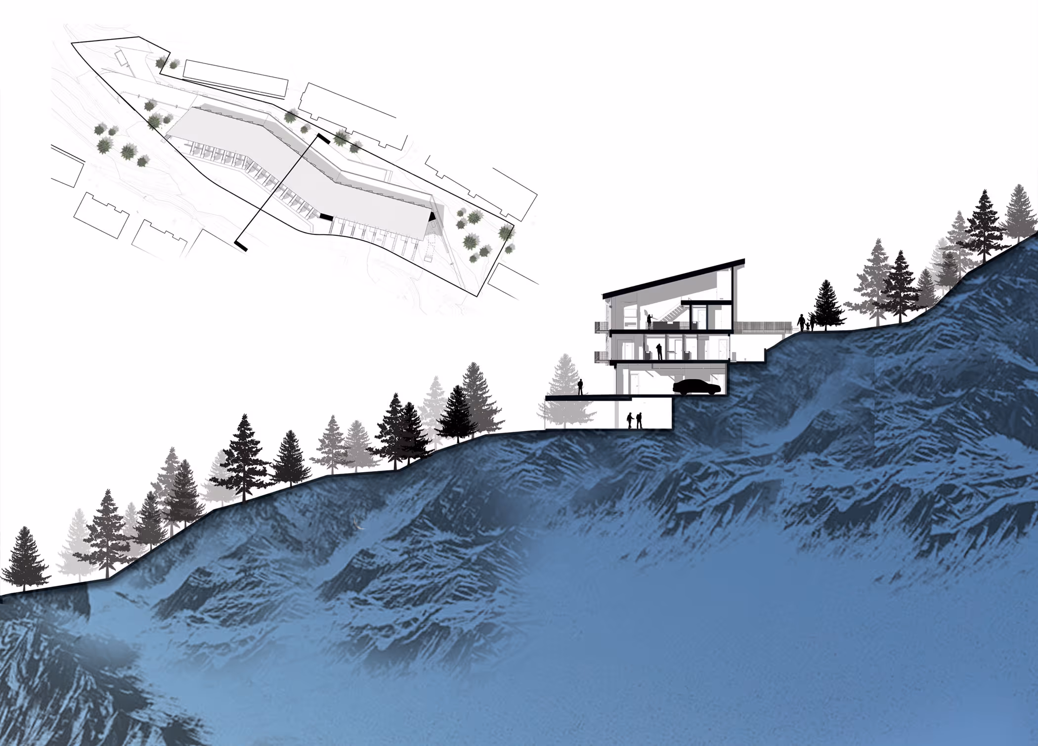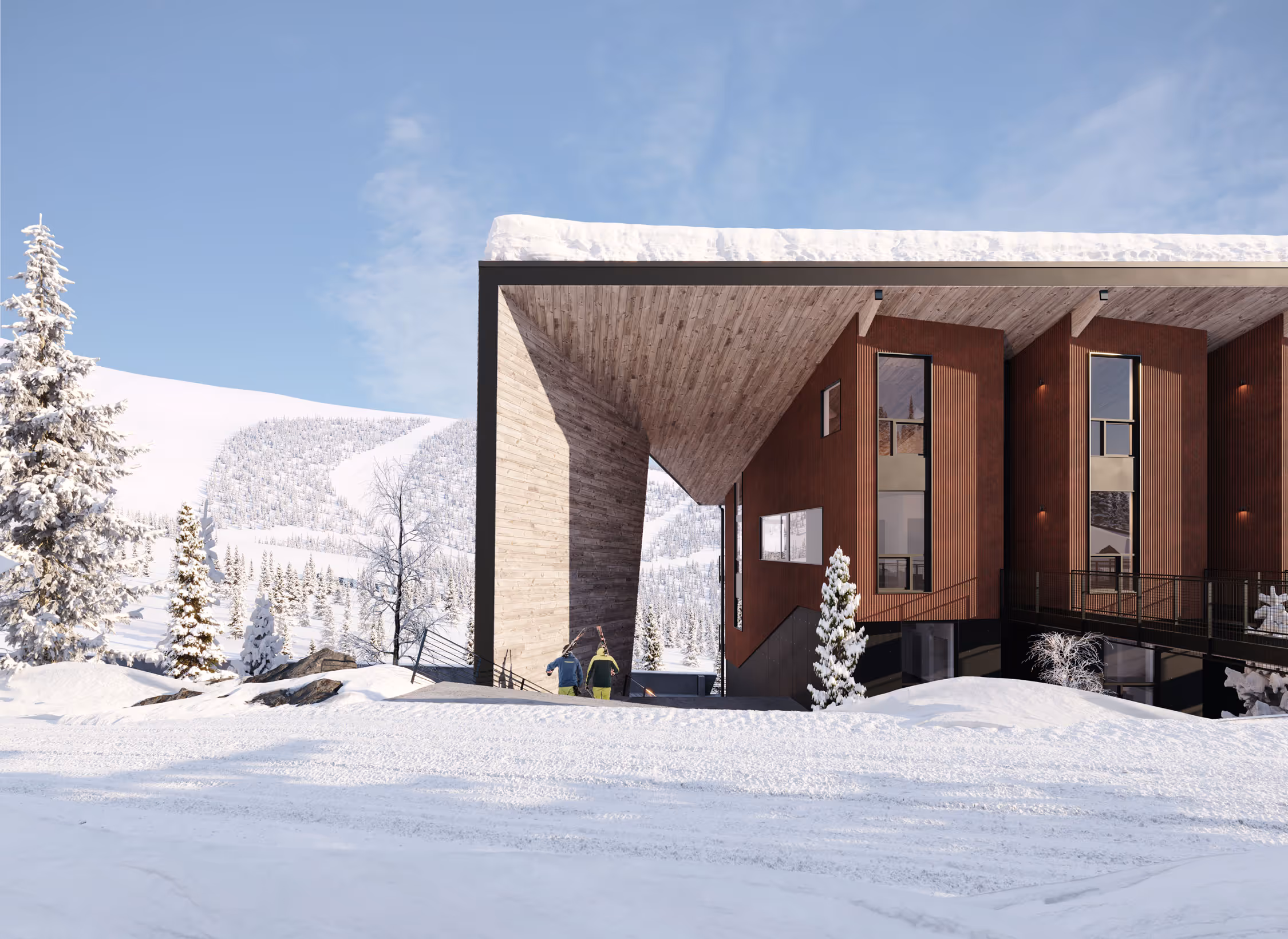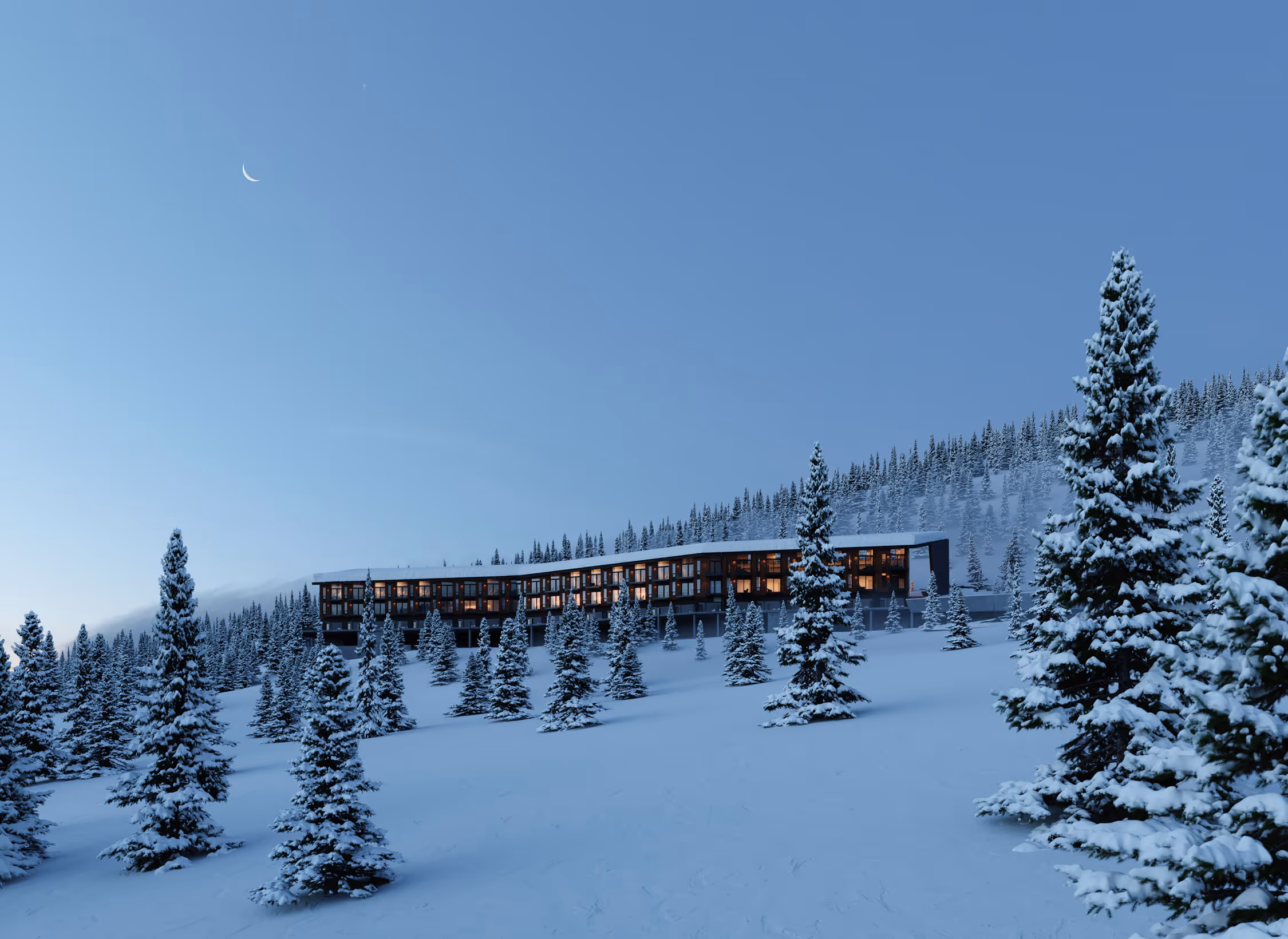Site conditions proved equally influential. The steep hillside and compact lot required the building form to adapt directly to the terrain. By shifting floor plates to follow the contours of the slope, excavation was minimized, costly shoring avoided, and the architecture given a subtle form that feels at ease with its setting. The result is a community that meets demand for modern mountain housing while reducing environmental disturbance and supporting the project’s budget and schedule.