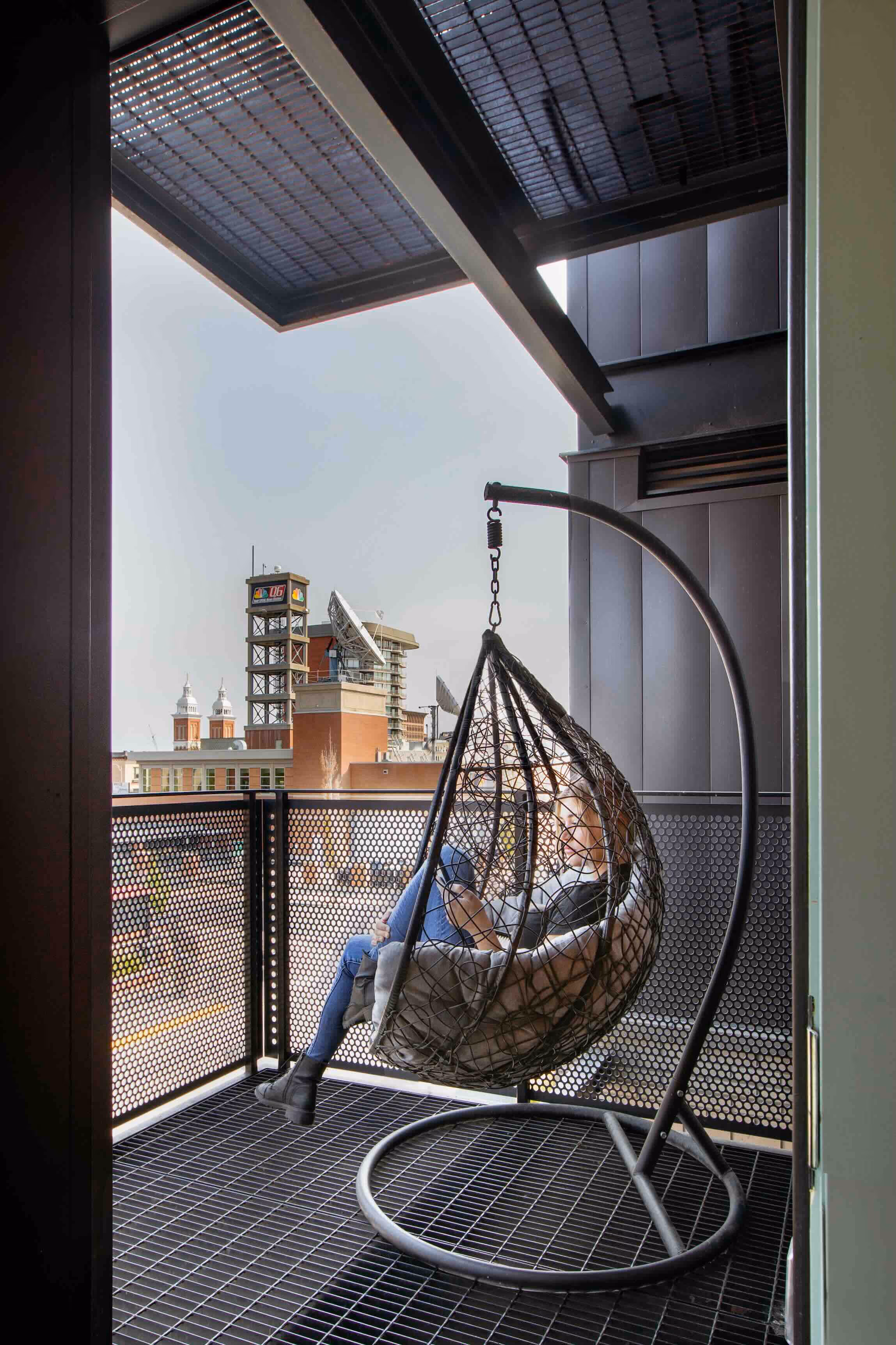 Patina panels introduce a sense of age and industry with a touch of playfulness, while awning windows recall the steel-framed glazing of neighboring historic buildings. Cantilevered decks feature steel grating inspired by the fire escapes that line First Avenue, grounding the project in a familiar visual language. At street level, generous landscaping, integrated benches, and pedestrian signage activate the sidewalk and invite community interaction, reinforcing the role of the ground floor as part of the public realm.